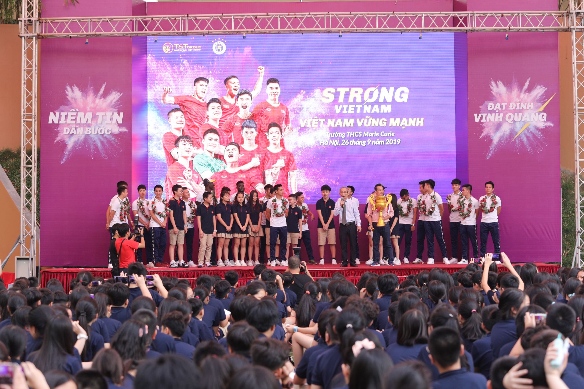 Khoảng 4000 học sinh của trường Marie Curie và các thầy cô trong trường đã hòa chung trong không khí vui tươi, náo nhiệt khi 19 cầu thủ của CLB bóng đá Hà Nội bước ra sân khấu giao lưu. Đây là số cầu thủ đông nhất tham gia chương trình Strong Vietnam kề tử khi chương trình bắt đầu, gồm các cầu thủ trụ cột của Hanoi FC như Quang Hải, Duy Mạnh, Đình Trọng, Hùng Dũng, Đức Huy, Văn Kiên, Bùi Tiến Dũng…và các cầu thủ ngoại như Pape Omar, Oseni, Kebe.