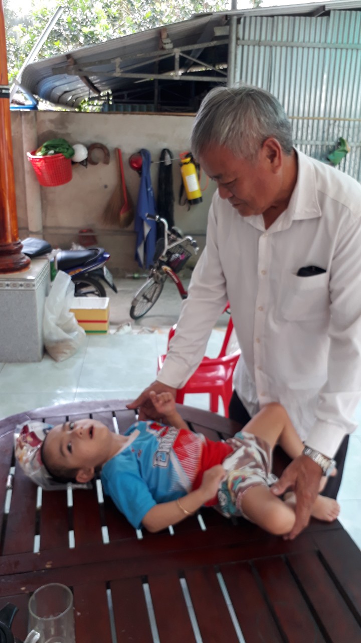 Ông Lê Văn Mơi đến thăm cháu Đoàn Phát Tài, 6 tuổi, NNCĐDC ở xã Hòa Định, bị bệnh bại liệt từ nhỏ