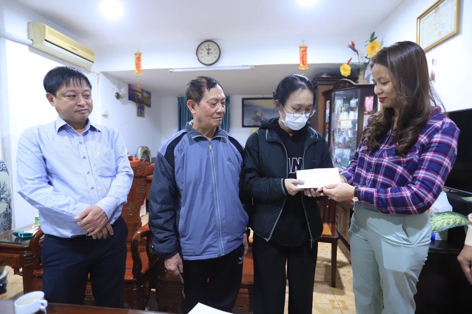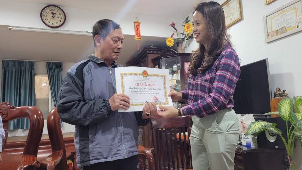 | Lãnh đạo UBND phường Tràng Tiền đã đến nhà biểu dương và trao tặng Giấy khen đối với ông Trần Long. Ảnh: Duy Khánh |
