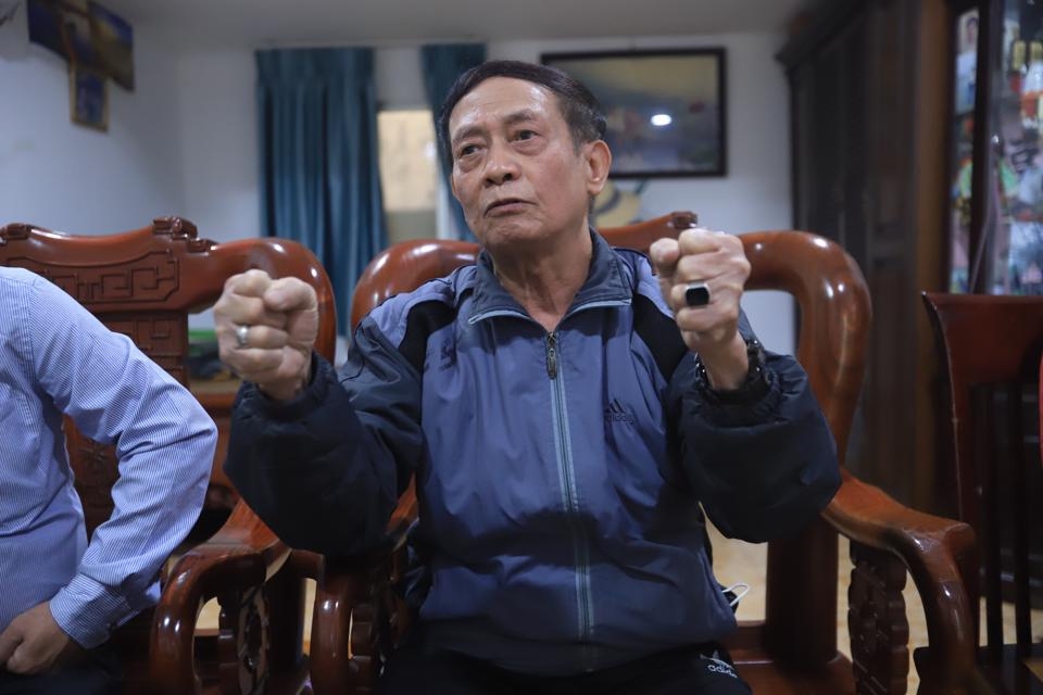 | Ông Trần Long thuật lại hành động dùng cờ -lê đập cửa cứu nữ sinh viên thoát khỏi đám cháy. Ảnh: Duy Khánh |
