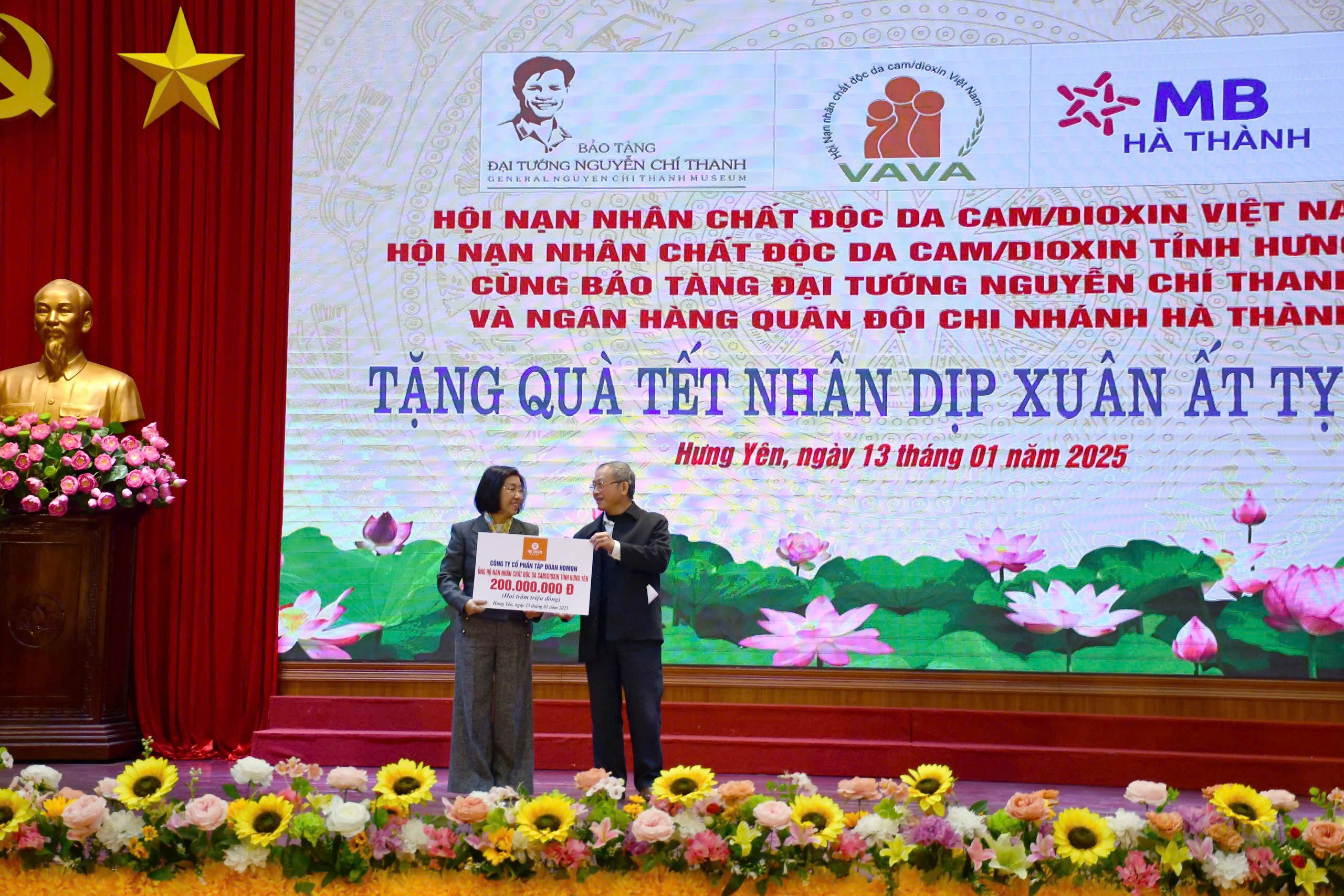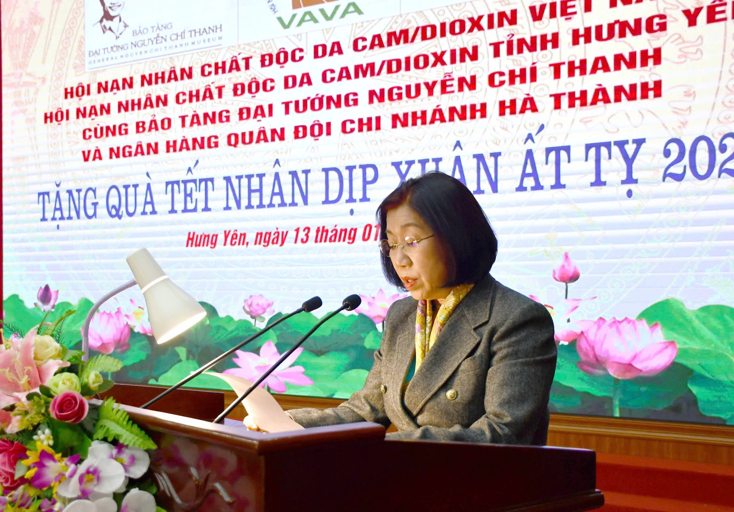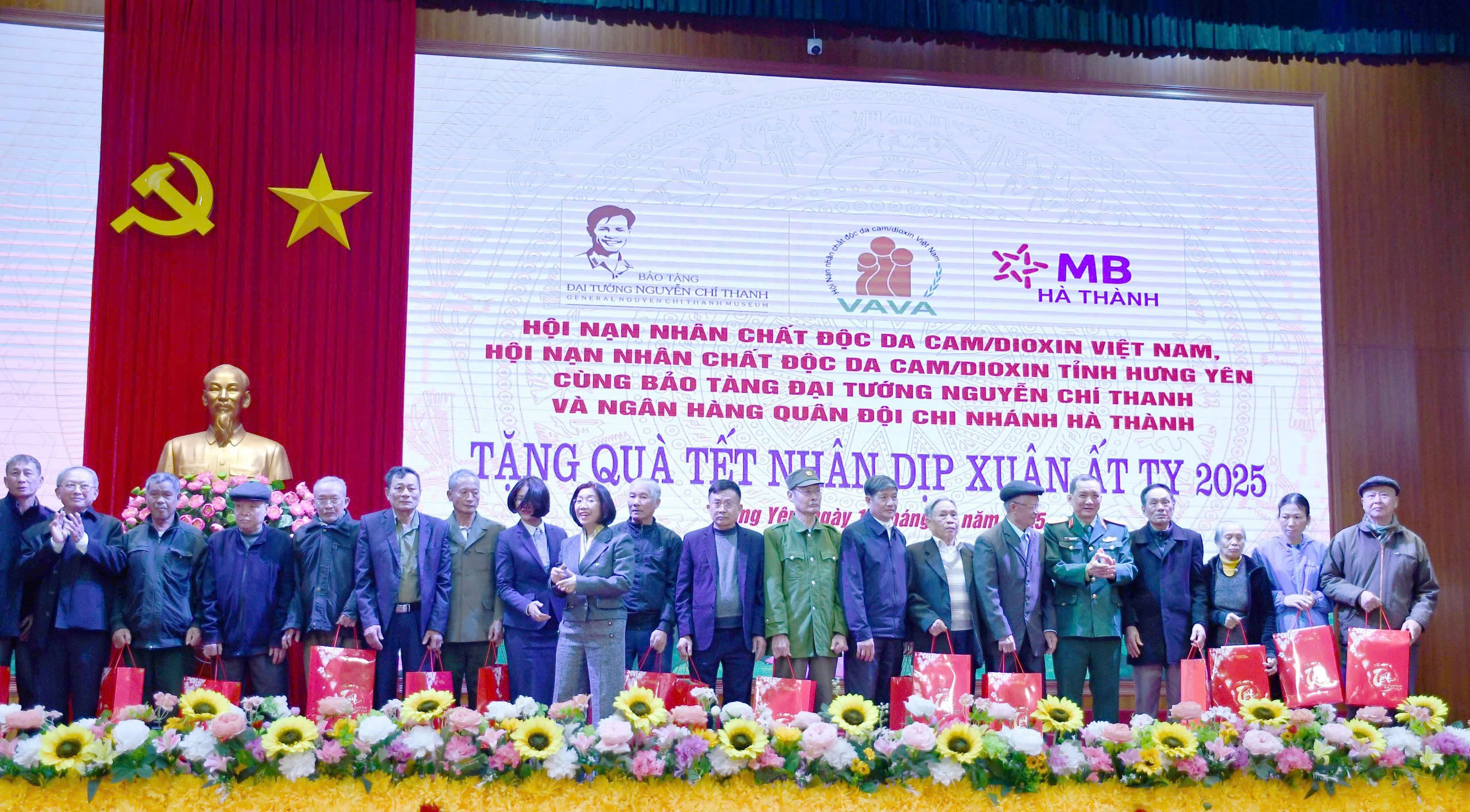 Ngày 13/1/2025, tại Hội trường Bộ chỉ huy Quân sự tỉnh, Hội NNCĐDC/dioxin Việt Nam phối hợp với Bảo tàng Đại tướng Nguyễn Chí Thanh tặng quà cho nạn nhân chất độc da cam tỉnh Hưng Yên. Dự buổi tặng quà có: Thiếu tướng Đỗ Hồng Lâm, Phó Chủ tịch Thường trực Hội NNCĐDC/dioxin Việt Nam; bà Đặng Thị Minh Ngọc, Phu nhân cố Thượng tướng Nguyễn Chí Vịnh; ông Lê Bằng Giang, Phó Giám đốc Bảo tàng Đại tướng Nguyễn Chí Thanh; bà Phạm Thị Bích Phượng, Phó Giám đốc Chi nhánh Hà Thành - Ngân hàng TMCP Quân đội; Đại tá Tô Thành Quyết, Chỉ huy trưởng Bộ chỉ huy Quân sự tỉnh; ông Phạm Gia Bình, Chủ tịch Hội NNCĐDC/dioxin tỉnh và cán bộ một số cơ quan, đoàn thể của tỉnh và Bộ CHQS tỉnh, cùng 140 NNCĐDC trên địa bàn tỉnh.