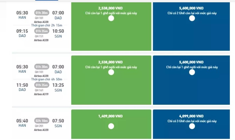 Trên các kênh bán vé trực tuyến, giá vé khứ hồi chặng bay Hà Nội - Đà Nẵng (đã gồm thuế phí) của Vietnam Airlines dao động từ 3-5 triệu đồng. Mức giá này cũng tương tự với Bamboo Airways, khoảng 3-4 triệu đồng tùy giờ bay. Giá vé bay của Vietjet Air dù có tăng như thường lệ, song vẫn thấp hơn so với Vietnam Airlines và Bamboo.