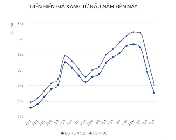 Từ 15h ngày 21/7, giá xăng E5 RON 92 trong nước giảm 2.710 đồng/lít còn 25.070 đồng/lít, xăng RON 95 giảm 3.600 đồng/lít còn 26.070 đồng/lít. Đây là lần giảm mạnh nhất của giá xăng từ đầu năm.