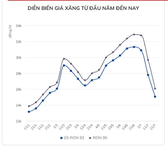 Từ 15h ngày 21/7, giá xăng E5 RON 92 trong nước giảm 2.710 đồng/lít còn 25.070 đồng/lít, xăng RON 95 giảm 3.600 đồng/lít còn 26.070 đồng/lít. Đây là lần giảm mạnh nhất của giá xăng từ đầu năm.