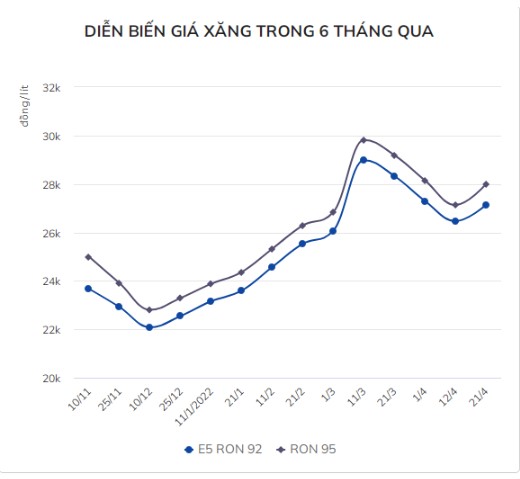 Từ ngày 21/4, giá xăng E5 RON 92 trong nước tăng 660 đồng/lít lên 27.130 đồng/lít và xăng RON 95 tăng thêm 680 đồng/lít lên 27.990 đồng/lít. Không chỉ xăng, giá các mặt hàng dầu tại kỳ điều hành lần này cũng được điều chỉnh tăng. Theo đó, giá bán đối với mặt hàng dầu diesel lên 25.359 đồng/lít; dầu hỏa là 23.828 đồng/lít và dầu mazut là 21.800 đồng/kg.
