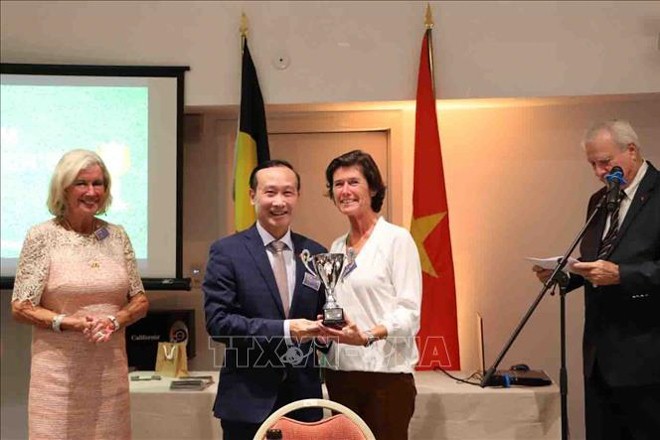 Đại sứ Việt Nam tại Vương quốc Bỉ Nguyễn Văn Thảo trao cúp cho golfer đoạt giải.
