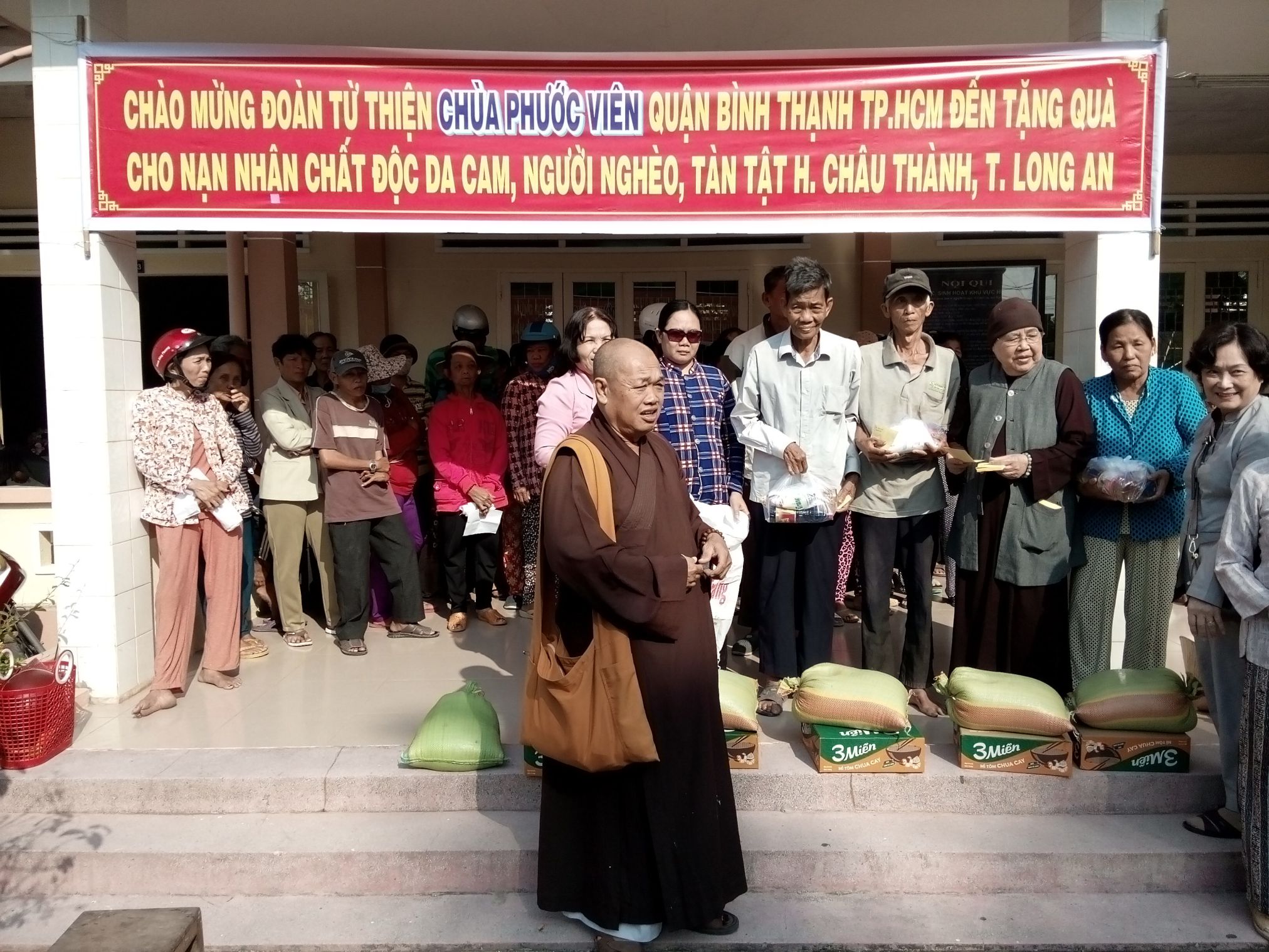Ni trưởng Thích Nữ Tắc Nhụy trụ trì chùa Vĩnh Long xã Tân Kim đã trao tặng 400 phần quà cho nạn nhân và hộ nghèo trị giá 80 triệu đồng;
