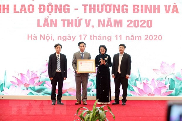Phó Chủ tịch nước Đặng Thị Ngọc Thịnh trao Huân chương Lao động hạng Nhì cho Vụ Bảo hiểm xã hội tại Đại hội thi đua yêu nước ngành Lao động-Thương binh và Xã hội tháng 11/2020.