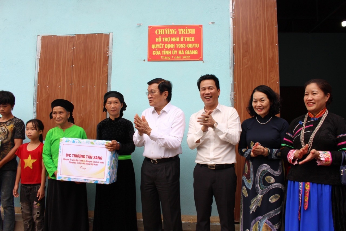 Cũng trong chiều 9/7, nguyên Chủ tịch nước Trương Tấn Sang và Đoàn công tác đã tham gia Lễ khánh thành và trao nhà ở theo Quyết định 1953 của Tỉnh ủy cho gia đình bà Khấu Thị Đẹp, hộ nghèo tại Bản Khén, xã Lạc Nông (Bắc Mê).