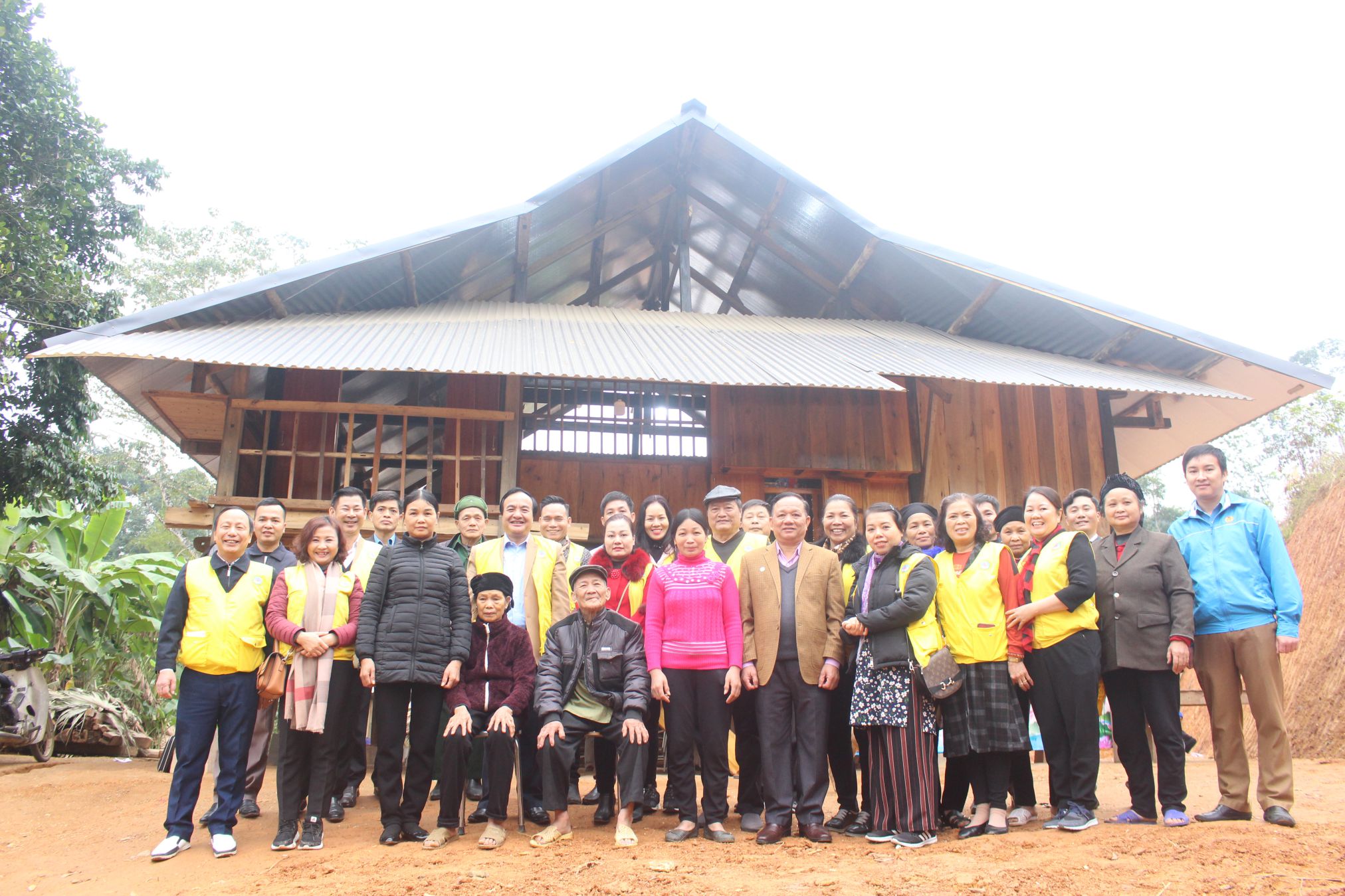 Đại biểu chụp ảnh lưu niệm trước nhà mới của ông Vi Đức Lèn,