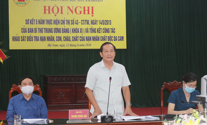Phát biểu tại Hội nghị, Trung tướng, PGS TS Đặng Nam Điền, Phó Chủ tịch, Tổng Thư ký Hội NNCĐDC/dioxin Việt Nam đã ghi nhận, đánh giá cao kết quả triển khai và hoạt động của Hội NNCĐDC/dioxin tỉnh Hà Nam trong thực hiện Chỉ thị 43-CT/TW của Ban Bí thư và triển khai thực hiện nhiệm vụ khoa học do Tung ương Hội giao điều tra khảo sát thống kê nNNCĐDC thế hệ thứ 3, thứ 4 năm 2020. Đồng thời đề nghị tỉnh Hà Nam nói chung, Hội NNCĐDC/dioxin các cấp nói riêng cần tiếp tục tuyên truyền, quán triệt và thực hiện có hiệu quả Chỉ thị 43-CT/TW, tập trung thực hiện tốt các chế độ chính sách đối với nạn nhân, củng cố xây dựng Hội các cấp vững mạnh, nắm chắc tình hình, kịp thời phản ánh những bất cập với cấp ủy chính quyền địa phương để tháo gỡ từ cơ sở. Trước mắt cần chủ động xây dựng kế hoạch tham mưu cho cấp ủy, chính quyền các cấp, tổ chức các hoạt động nhân kỷ niệm 60 năm ngày thảm họa da cam ở Việt Nam và 15 năm ngày Thành lập Hội NNCĐDC/dioxin tỉnh Hà Nam.