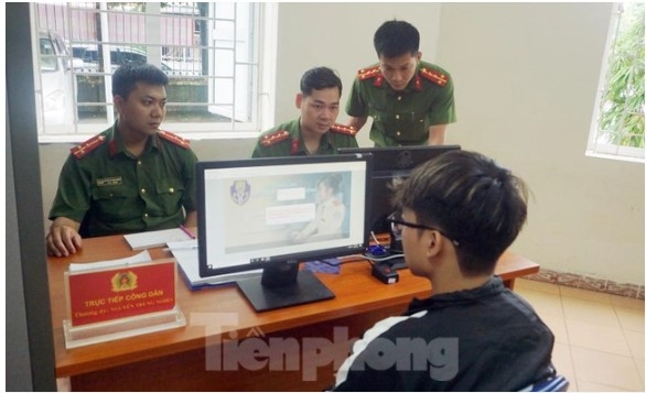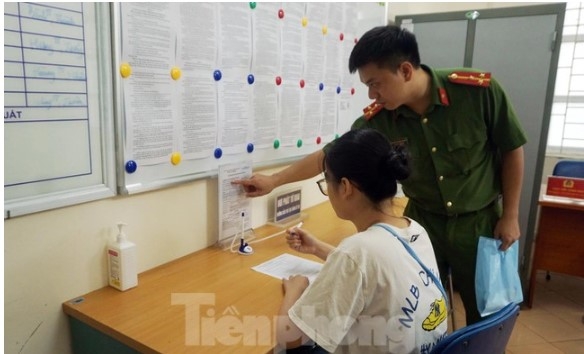 | Cán bộ chiến sĩ hướng dẫn công dân điền tờ khai. Ảnh: Thanh Hà |