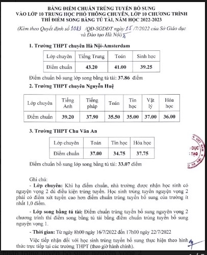 Cụ thể, điểm chuẩn vào lớp 10 một số trường THPT chuyên/có lớp chuyên ở Hà Nội được điều chỉnh hạ xuống như sau: