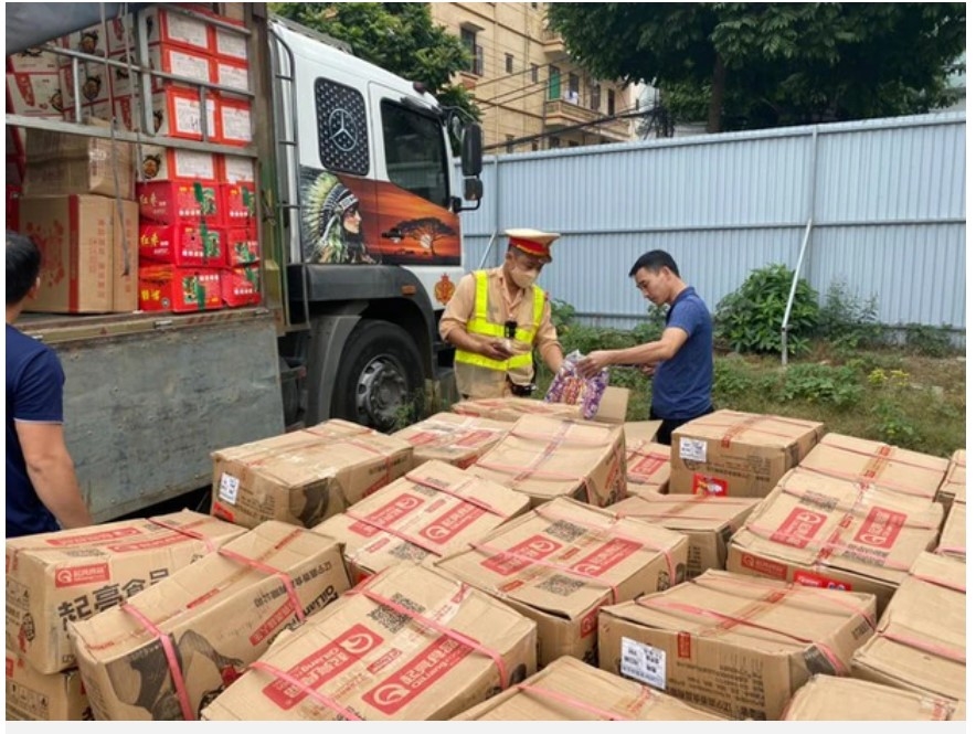 Kết quả kiểm tra cho thấy, xe này đang vận chuyển khối lượng lớn xúc xích, bánh quy có dấu hiệu vi phạm pháp luật. Tài xế đã không xuất trình được giấy tờ chứng minh nguồn gốc xuất xứ số hàng trên.