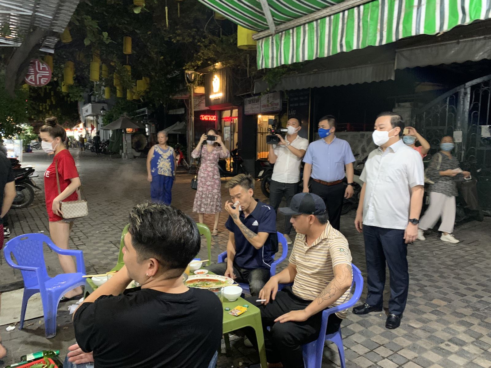 Gần 23 giờ, đoàn kiểm tra phát hiện cơ sở Mập quán (số 373 phố Trần Khát Chân, phường Thanh Nhàn, quận Hai Bà Trưng) có dấu hiệu phục vụ thực khách quá thời gian quy định. Đoàn kiểm tra đã yêu cầu lực lượng chức năng quận Hai Bà Trưng tiến hành điều tra làm rõ, xử lý nghiêm vi phạm nếu có. Đoàn kiểm tra cũng tiến hành kiểm tra, nhắc nhở việc thực hiện các quy định phòng dịch của các cơ sở ăn uống, karaoke tại phố ẩm thực Tống Duy Tân (phường Hàng Bông, quận Hoàn Kiếm)...