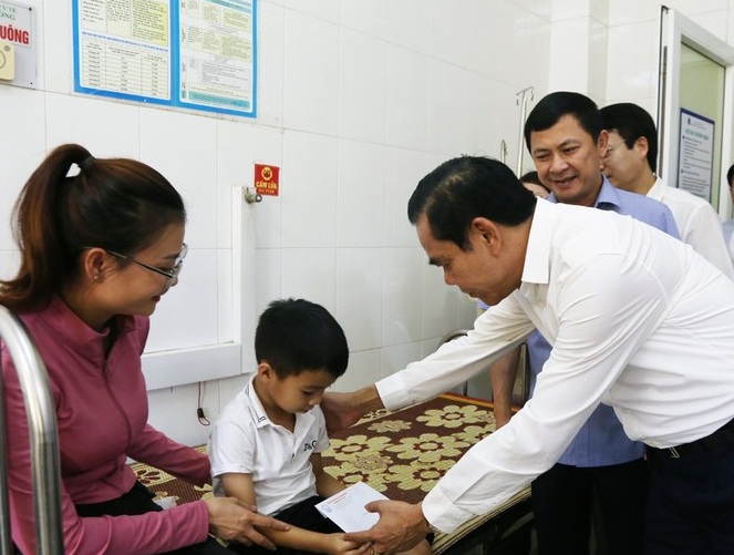 Chủ tịch UBND tỉnh Hà Tĩnh Võ Trọng Hải tặng quà, ân cần hỏi thăm sức khỏe của các bệnh nhi đang điều trị tại Bệnh viện