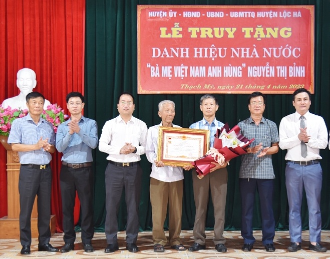 Theo đó, UBND huyện Lộc Hà tổ chức trọng thể Lễ truy tặng danh hiệu Bà mẹ Việt Nam anh hùng cho mẹ Nguyễn Thị Bỉnh. Mẹ Nguyễn Thị Bỉnh sinh năm 1904, tại xã Phù Lưu (huyện Lộc Hà). Trong chiến tranh chống Mỹ cứu nước, mẹ Nguyễn Thị Bỉnh ở xã Thạch Mỹ, huyện Lộc Hà (Hà Tĩnh) đã 5 lần tiễn chồng và con trai lên đường phục vụ cách mạng nhưng chỉ 3 lần được đón các con trở về, chồng và người con trai thứ 2 của mẹ đã hy sinh.