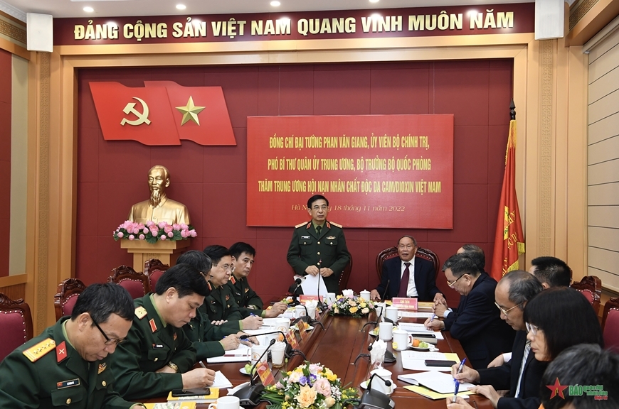 | Đại tướng Phan Văn Giang, Ủy viên Bộ Chính trị, Phó Bí thư Quân ủy Trung ương, Bộ trưởng Bộ Quốc phòng tại buổi thăm, làm việc với Trung ương Hội Nạn nhân chất độc da cam/dioxin Việt Nam ngày 18/11/2022 |