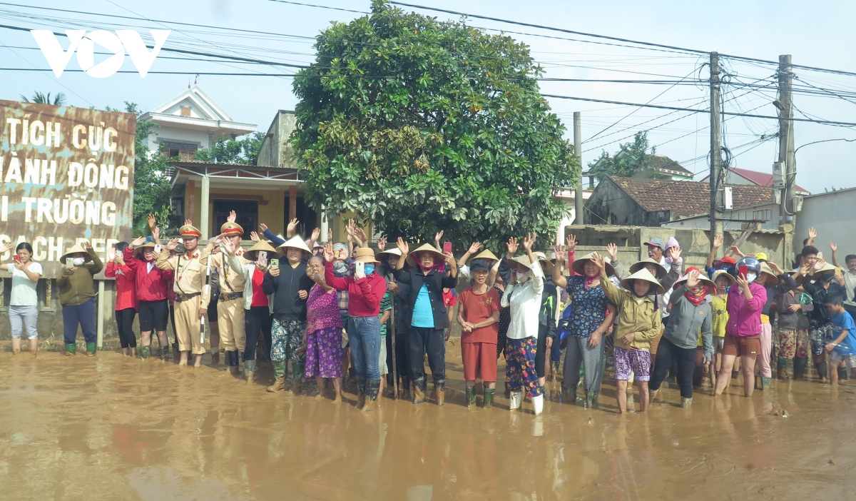 Bà con vùng lũ xã Hiền Ninh, huyện Quảng Ninh, tỉnh Quảng Bình chào đón Đoàn công tác của Thủ tướng đến thăm.