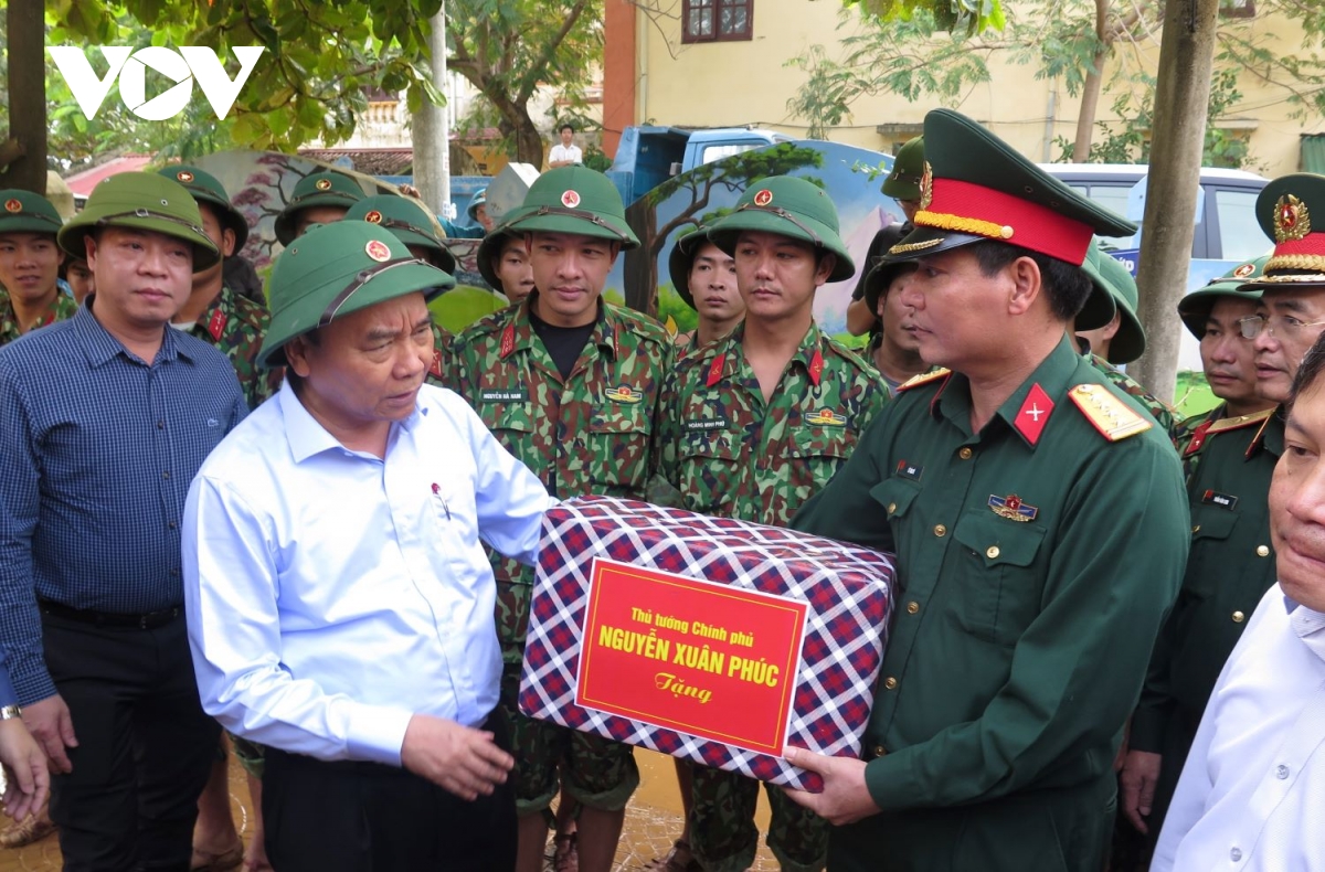 Thủ tướng tặng quà cán bộ, chiến sĩ Quân Khu 4 giúp dân khắc phục hậu quả lũ lụt.
