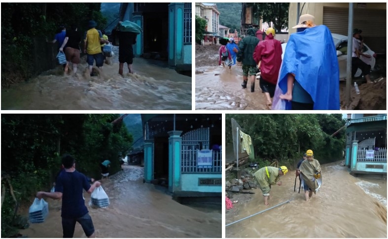 Hiện tại ở thị trấn Mường Xén, xã Tà Cạ đang bị lũ cô lập, nhiều người dân cùng chính quyền địa phương phối hợp nối đuôi nhau băng qua dòng lũ chảy xiết để tiếp tế lương thực vào trong xã.
