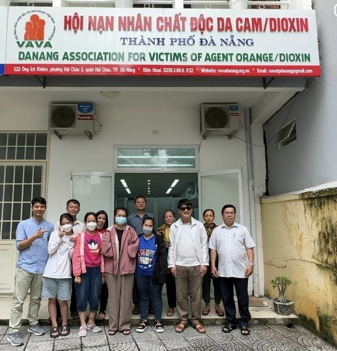 | Ông Tô Năm, Chủ tịch Thành hội Đà Nẵng và Ông Vũ Xuân Thành, Hội Bảo trợ trẻ em Việt Nam nhiễm dioxine (VNED) tại TP Hồ Chí Minh chụp ảnh lưu niệm cùng các em học sinh Đà Nẵng nhận học bổng |