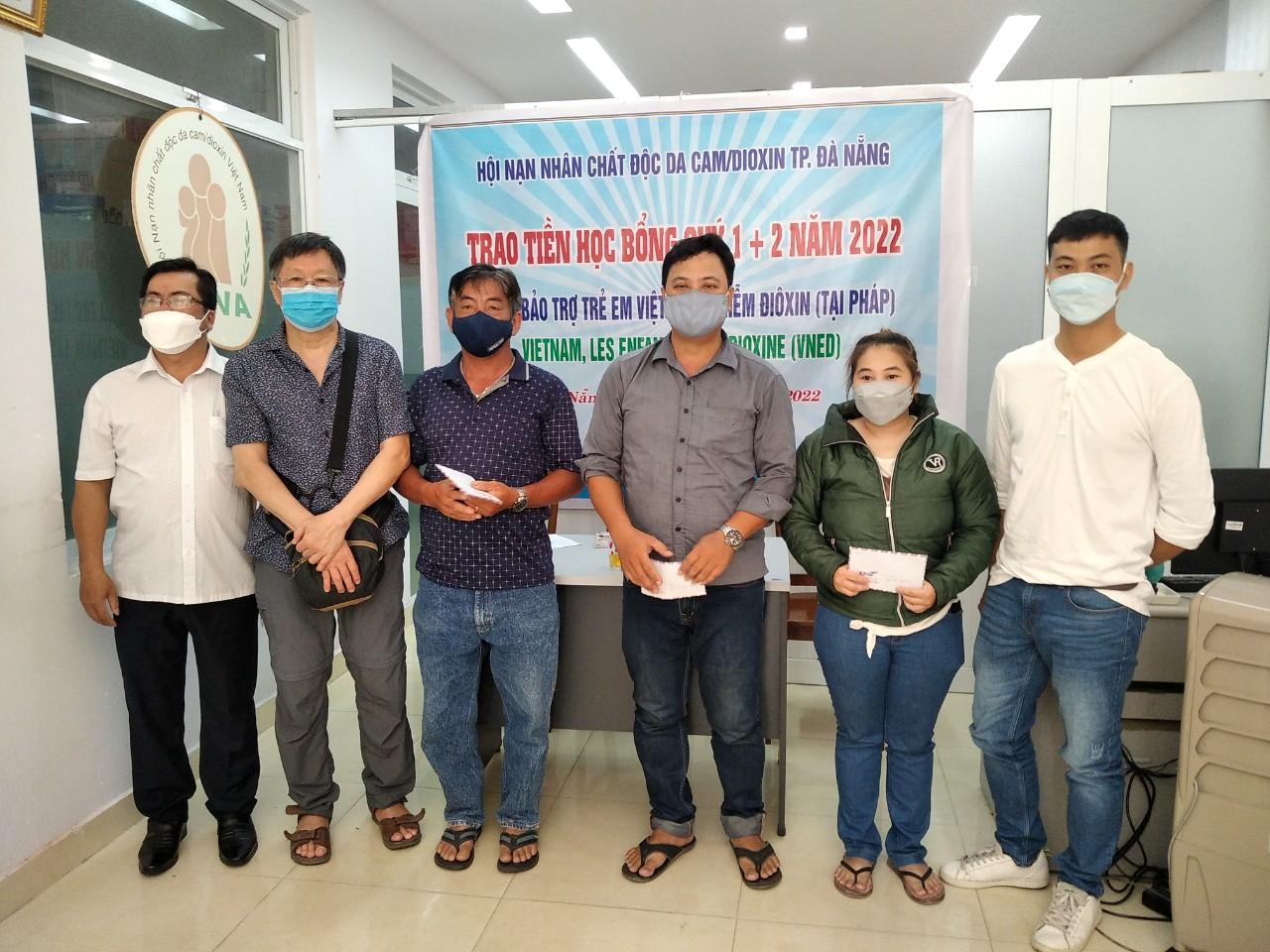 Ngày 23/4/2022, Hội NNCĐDC/dioxin TP. Đà Nẵng phối hợp với Hội Bảo trợ trẻ em Việt Nam nhiễm dioxine tại Pháp (VNED) tổ chức trao học bổng quý 1 và 2/2022 cho học sinh là NNCĐDC có hoàn cảnh khó khăn, mỗi suất học bổng trị giá từ 1,500,000 đến 2.500,000 đồng/em, tổng số tiền hỗ trợ đợt này hơn 17 triệu đồng. Trao học bổng, Hội NNCĐDC/dioxin và VNED mong muốn giúp đỡ các em học sinh nạn nhân có thêm điều kiện và nghị lực phấn đấu vươn lên trong học tập. Tại mỗi đợt nhận học bổng các em đã gửi giấy khen, thành tích học tập của mình, thư cảm ơn tri ân cho những người đỡ đầu tại Pháp biết và theo dõi tình hình học tập, sức khỏe cũng như hoàn cảnh gia đình hiện nay. Ngoài ra Hội VNED, dịp này tiếp tục hỗ trợ cho vay vốn, mỗi gia đình 7 triệu đồng để buôn bán nhỏ (như bán rau hành, làm đồ mã, tạp hóa, nước mía, phế liệu, sửa chữa nhà...) tạo điều kiện cho một số gia đình phát triển kinh tế tăng thu nhập.