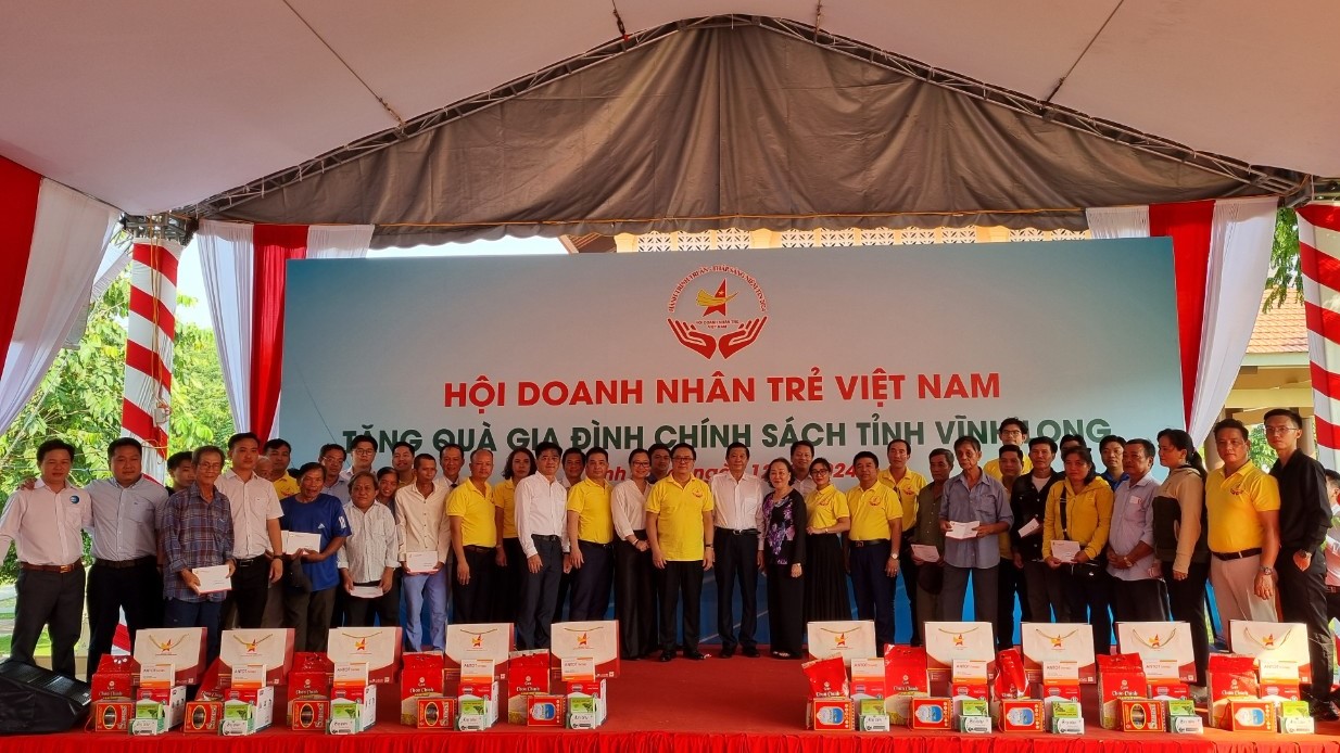 Trong chuỗi các hoạt động kỷ niệm 16 năm ngày mất của n guyên Thủ tướng Chính phủ Võ Văn Kiệt, chiều 12/6/2024, tại Khu lưu niệm Thủ tướng Chính phủ Võ Văn Kiệt (huyện Vũng Liêm, tỉnh Vĩnh Long), Hội Doanh nhân trẻ Việt Nam đã trao tặng 50 phần quà cho nạn nhân chất chất độc da cam, gia đình chính sách có hoàn cảnh khó khăn trên địa bàn huyện Vũng Liêm và huyện Mang Thít.
