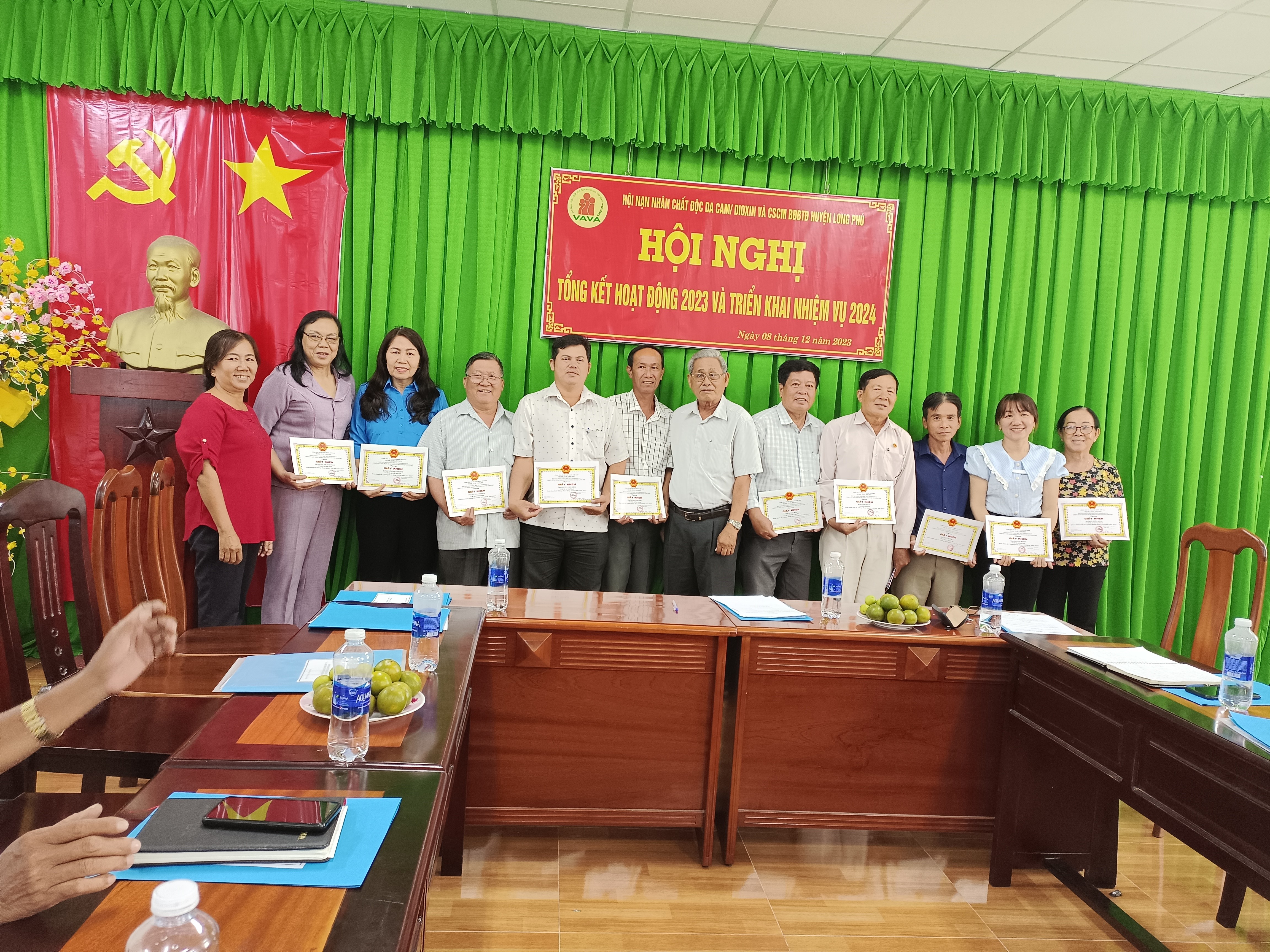 Nhân dịp tổng kết năm 2023, Hội NNCĐDC/dioxin và Hội CSCMBĐBTĐ huyện Long phú được Hội CSCMBĐBTD tỉnh tặng giấy khen cho 1 tập thể, 2 cá nhân, Hội NNCĐDC/dioxin và Hội CSCMBĐBTĐ huyện tặng 15 giấy khen cho cá nhân đã hoàn thành xuất sắc và hoàn thành tốt nhiệm vụ./.