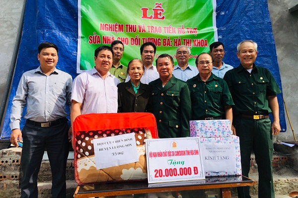 Ngày 28/10/2020, Hội NNCĐDC/dioxin huyện Lương Sơn, tỉnh Hòa Bình phối hợp các ban, ngành đoàn thể và chính quyền địa phương đến thăm và trao tiền hỗ trợ sửa chữa nhà ở cho gia đình bà Hà Thị Khoa là NNCĐDC có hoàn cảnh đặc biệt khó khăn về nhà ở tại thôn Gò Mu, xã Thanh Cao.