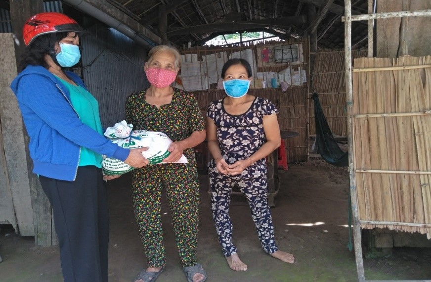 Bà Đinh Thị Đẹp- Ủy viên BCH Hội NNCĐDC/dioxin- BVQTE huyện Mỏ Cày Nam, CT. Hội NNCĐDC/dioxin- BVQTE xã Phước Hiệp trao quà cho NNCĐDC tại xã Phước Hiệp, huyện Mỏ Cày Nam, tỉnh Bến Tre