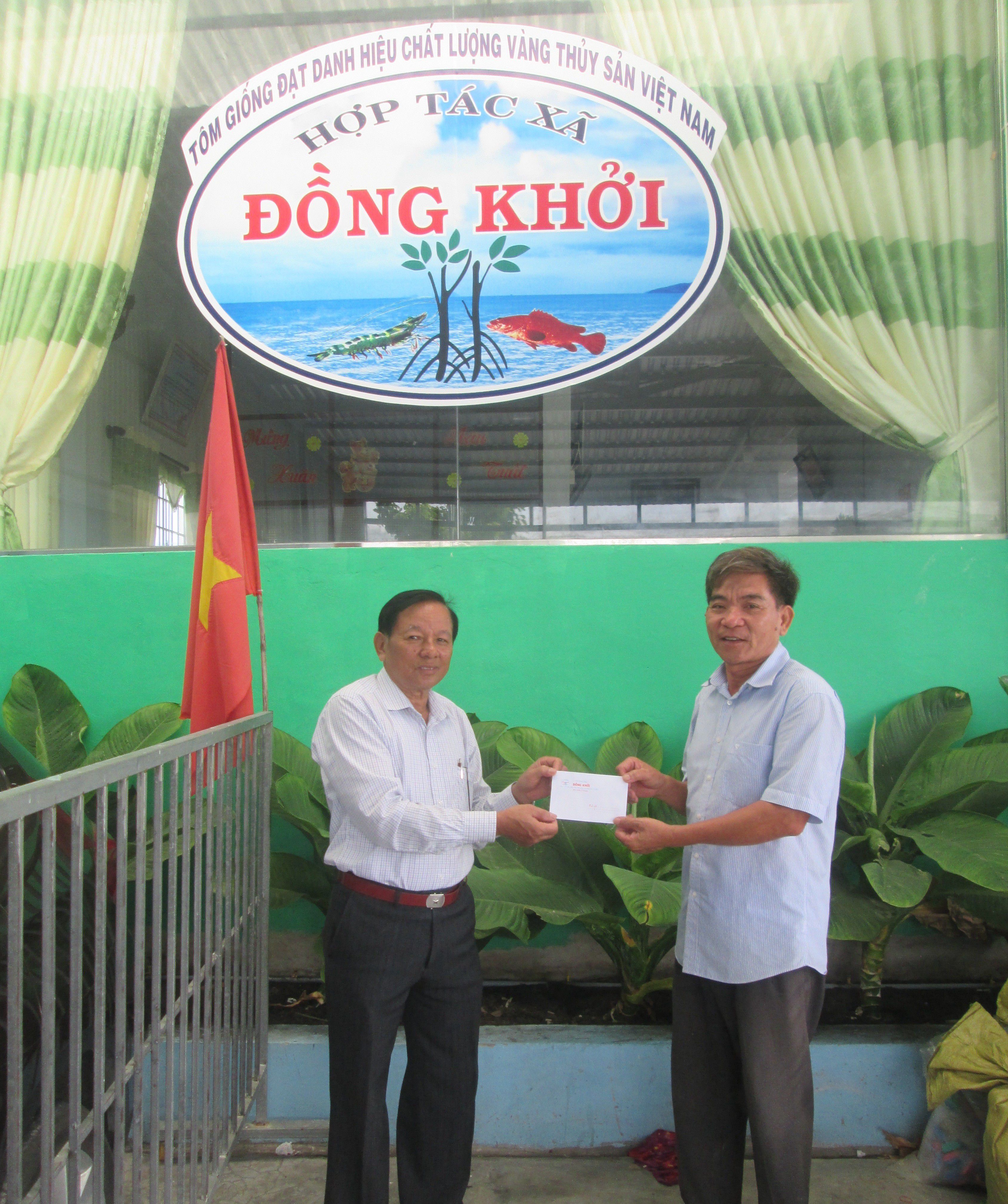 Chủ tịch Huyện hội nhận tiền ủng hộ Quỹ NNCĐDC của HTX SX tôm giống Đồng Khởi.