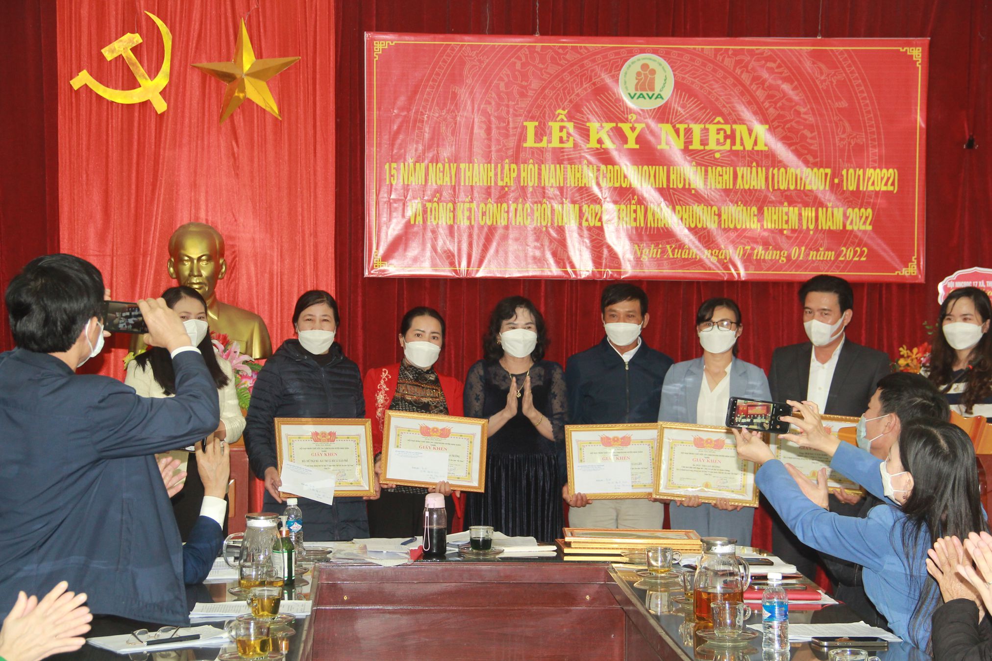 Nhân dịp này, thừa ủy quyền của UBND tỉnh, lãnh đạo Hội tỉnh Hà Tĩnh đã trao bằng khen của Chủ tịch UBND tỉnh cho Hội huyện Nghi Xuân vì đã có thành tích xuất sắc trong 5 năm 2016-2021; trao bằng khen của UBMTTQ tỉnh Hà Tĩnh cho 1 tập thể, 1 cá nhân vì có thành tích xuất sắc giai đoạn 2011-2021 và trao nhiều giấy khen của các cấp khác.