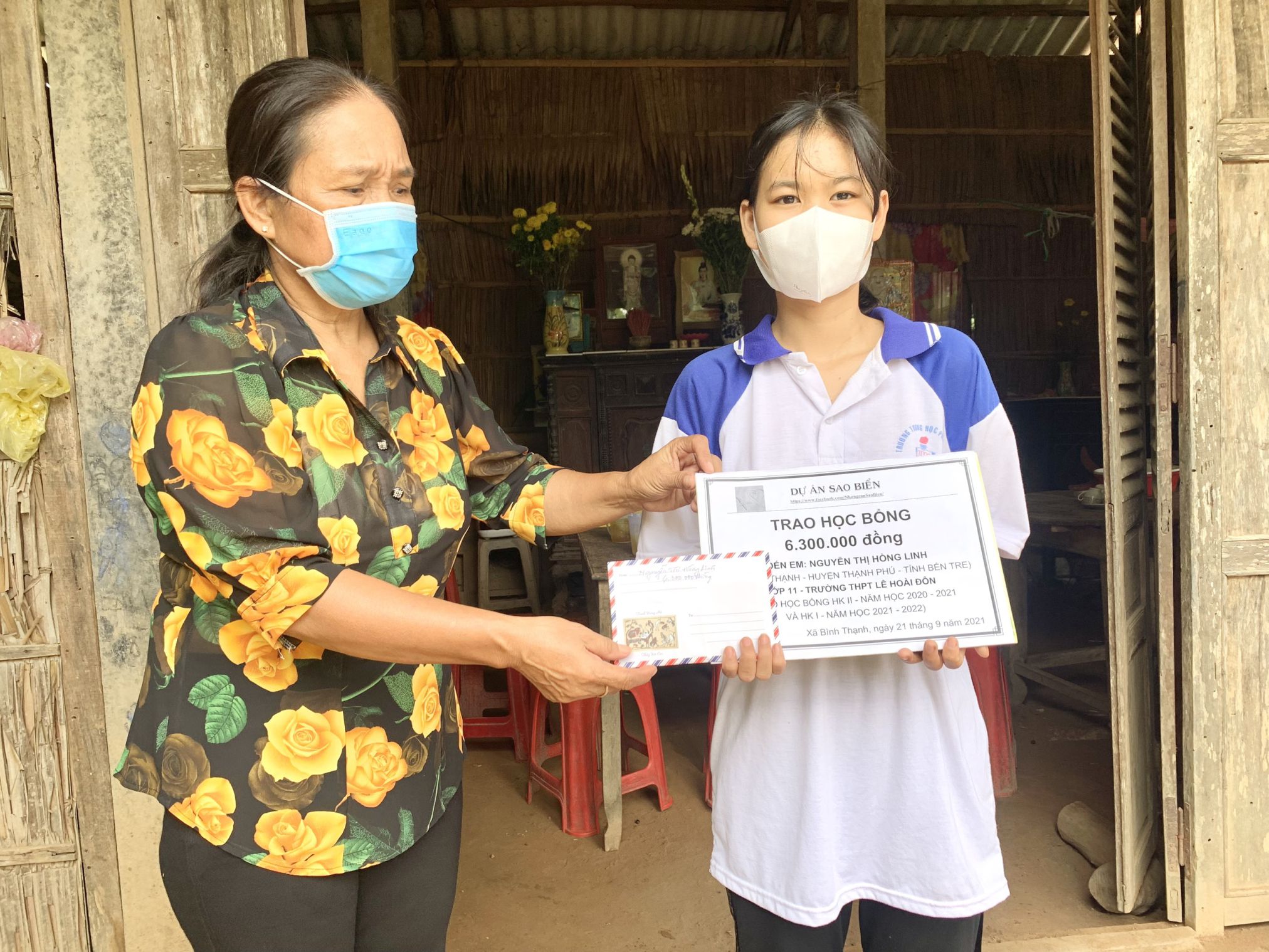 Sáng 25/9/2021, người đại diện Dự án Sao biển - Thành phố Hồ Chí Minh ủy thác cho bà Nguyễn Thị Kim Hải - huyện Thạnh Phú, tỉnh Bến Tre đến trao 02 suất học bổng cho 02 học sinh Trung học phổ thông, học lực khá giỏi có hoàn cảnh đặc biệt khó khăn ở xã Bình Thạnh, huyện Thạnh Phú.