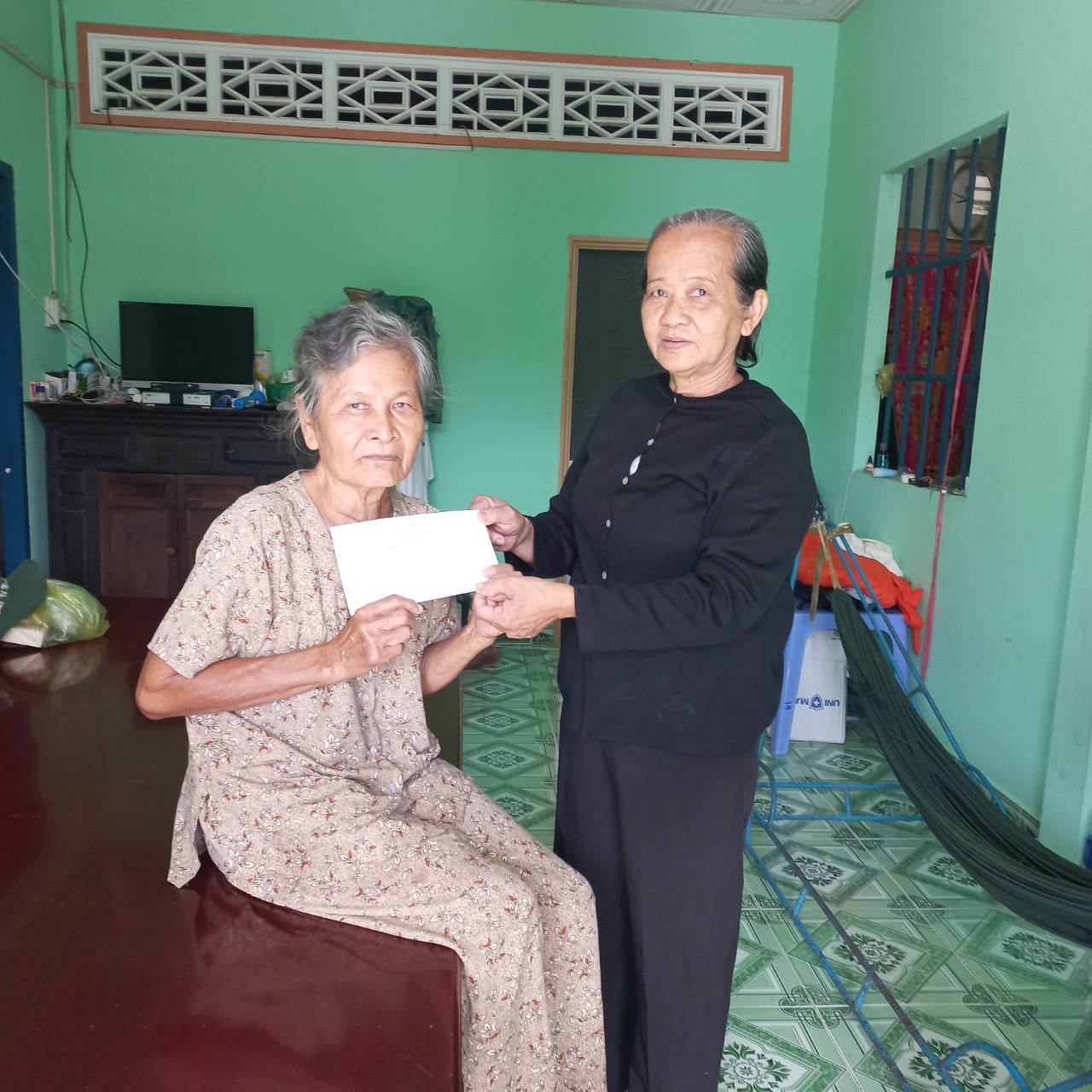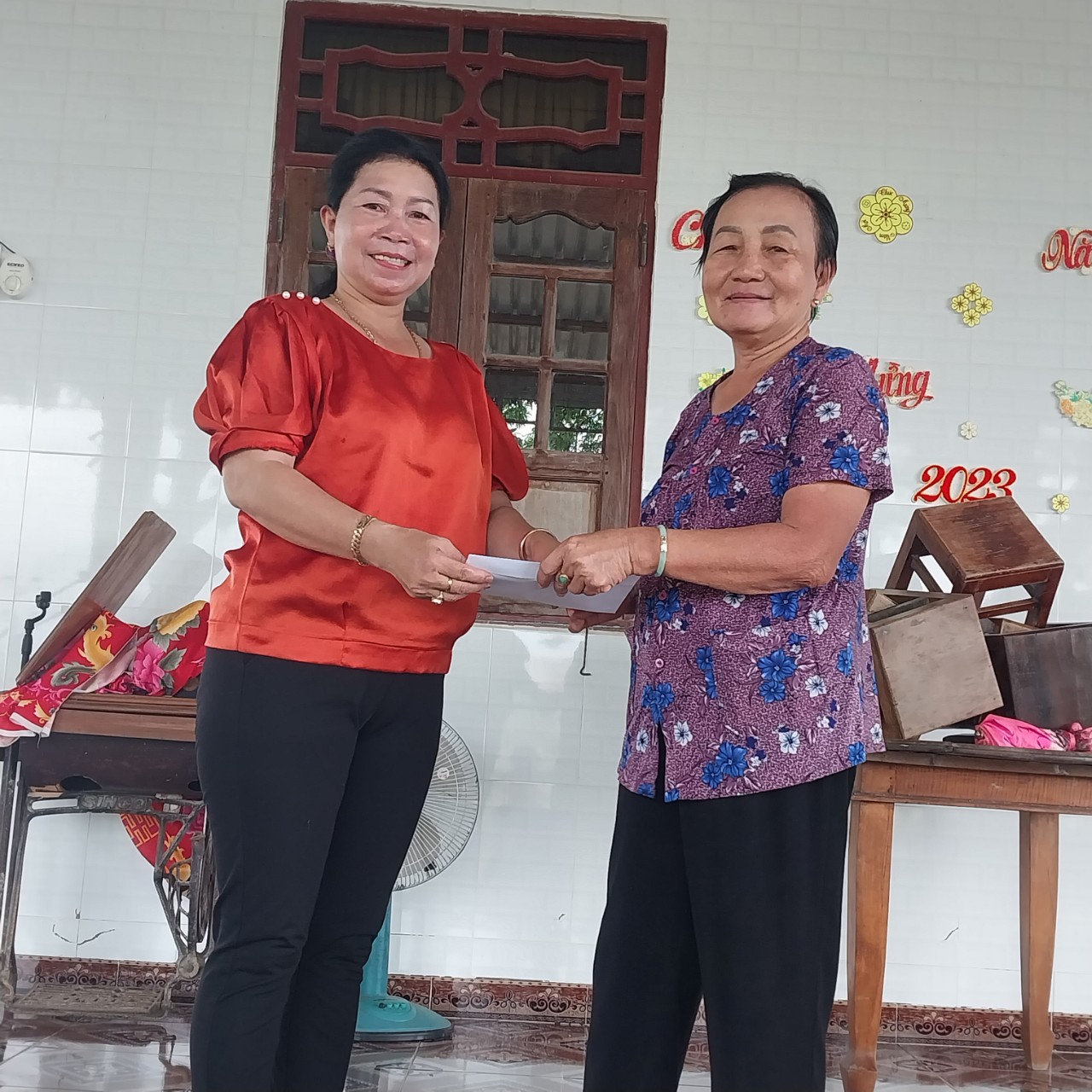 Chủ tịch Hội NNCĐDC/dioxin xã Long Thạnh (bên trái) tặng quà cho nạn nhân chất độc da cam
