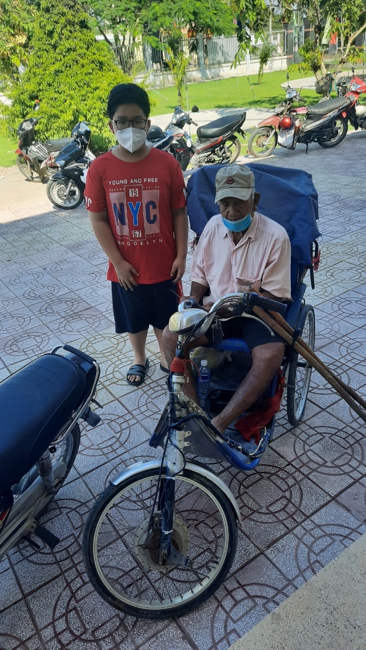 | Gia đình ông Hùng tặng quà cho nạn nhân, người khuyết tật xã Mỹ Thạnh |