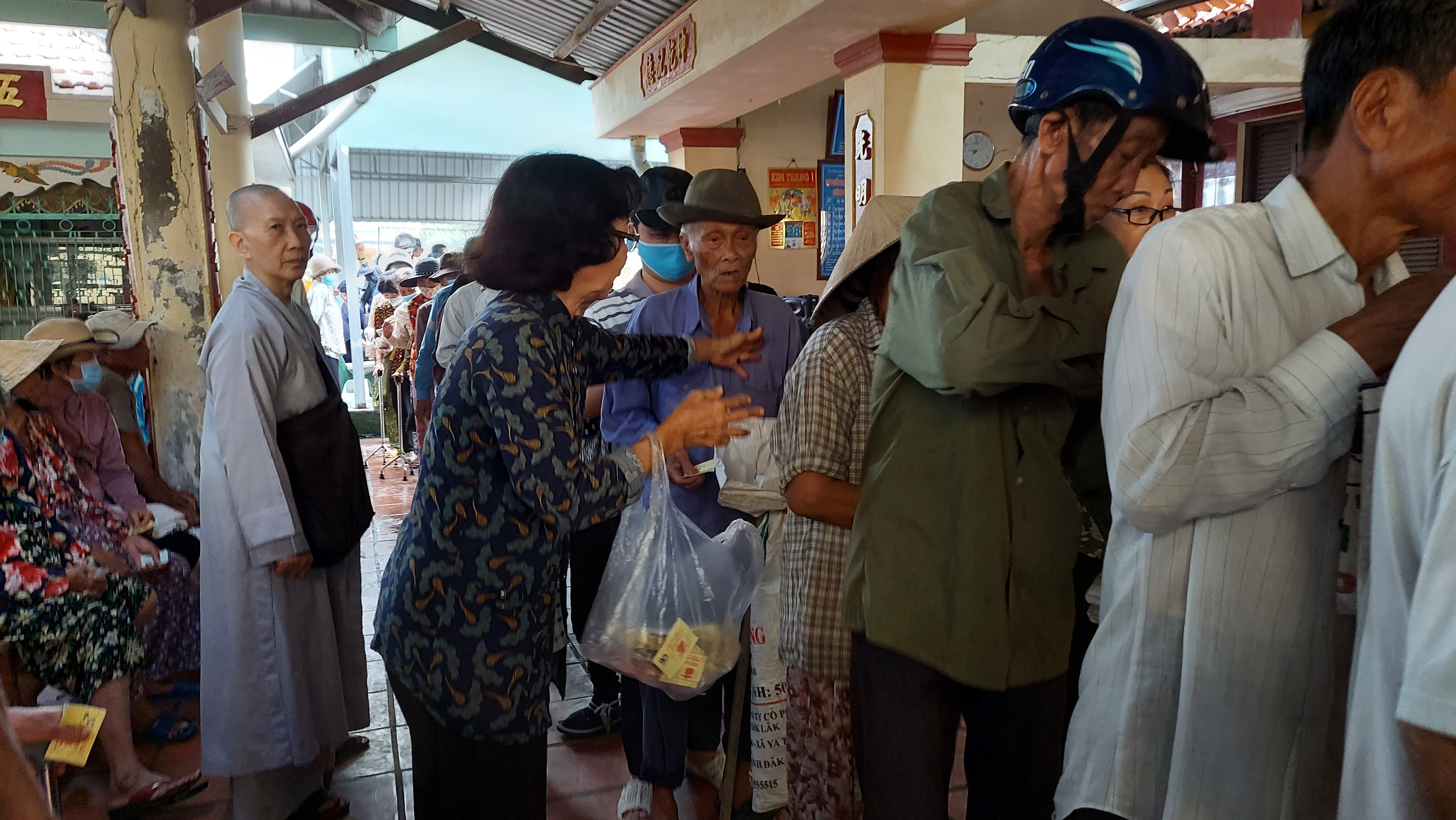 Quang cảnh buổi trao quàNi sư Thích Nữ Bảo Tâm cùng lãnh đạo Huyện hội trực tiếp trao quà cho nạn nhân