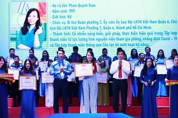 | Bí thư thứ nhất Trung ương Đoàn Bùi Quang Huy và Chủ tịch Hội Cựu thanh niên xung phong Việt Nam Vũ Trọng Kim trao giải thưởng “Thanh niên sống đẹp” năm 2022 cho các cá nhâ |