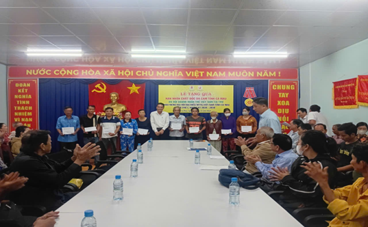 Tại đây đã trao 50 suất quà cho nạn nhân chất độc da cam ở 10 xã, phường trên địa bàn tỉnh gồm 8 xã: Tạ An Khương; Đầm Dơi; Lương Thế Trân; Tân Hưng; Phước Long; Định Thành; Vĩnh Lợi; Hòa Bình và 2 phường: Tân Thành; Giá Rai. Mỗi suất quà trị giá 2.000.000 đồng tiền mặt, với tổng trị giá 100.000.000 đồng. Nguồn hỗ trợ này do Hội Doanh nhân trẻ tỉnh Cà Mau được Hội Doanh nhân trẻ Việt Nam hỗ trợ.