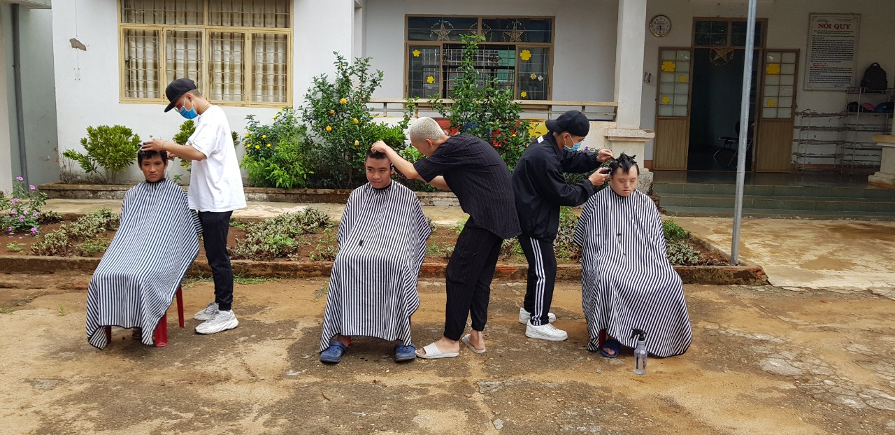 Các Thanh niên đang cắt tóc cho các cháu nạn nhân tại Trung tâm