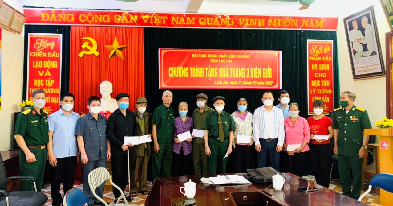 Trong khuôn khổ chương trình “Tháng ba biên giới”, từ nguồn hỗ trợ của Hội Doanh nhân trẻ Việt Nam, từ ngày 17/3 đến ngày 22/3/2022, Hội Nạn nhân chất độc da cam/dioxin tỉnh Lào Cai đã tổ chức chương trình tặng quà cho các nạn nhân CĐDC có hoàn cảnh khó khăn tại 3 huyện biên giới: Bát Xát, Mường Khương và thành phố Lào Cai. Dự chương trình tại huyện Mường Khương có đồng chí Bùi Sỹ Thu, Chủ tịch Hội NNCĐDC/dioxin tỉnh Lào Cai cùng các đồng chí đi trong đoàn; phía huyện Mường Khương có đồng chí Tô Việt Thành, Phó Chủ tịch UBND huyện, lãnh đạo Phòng Lao động TB&XH huyện, cấp ủy, chính quyền các xã của huyện.