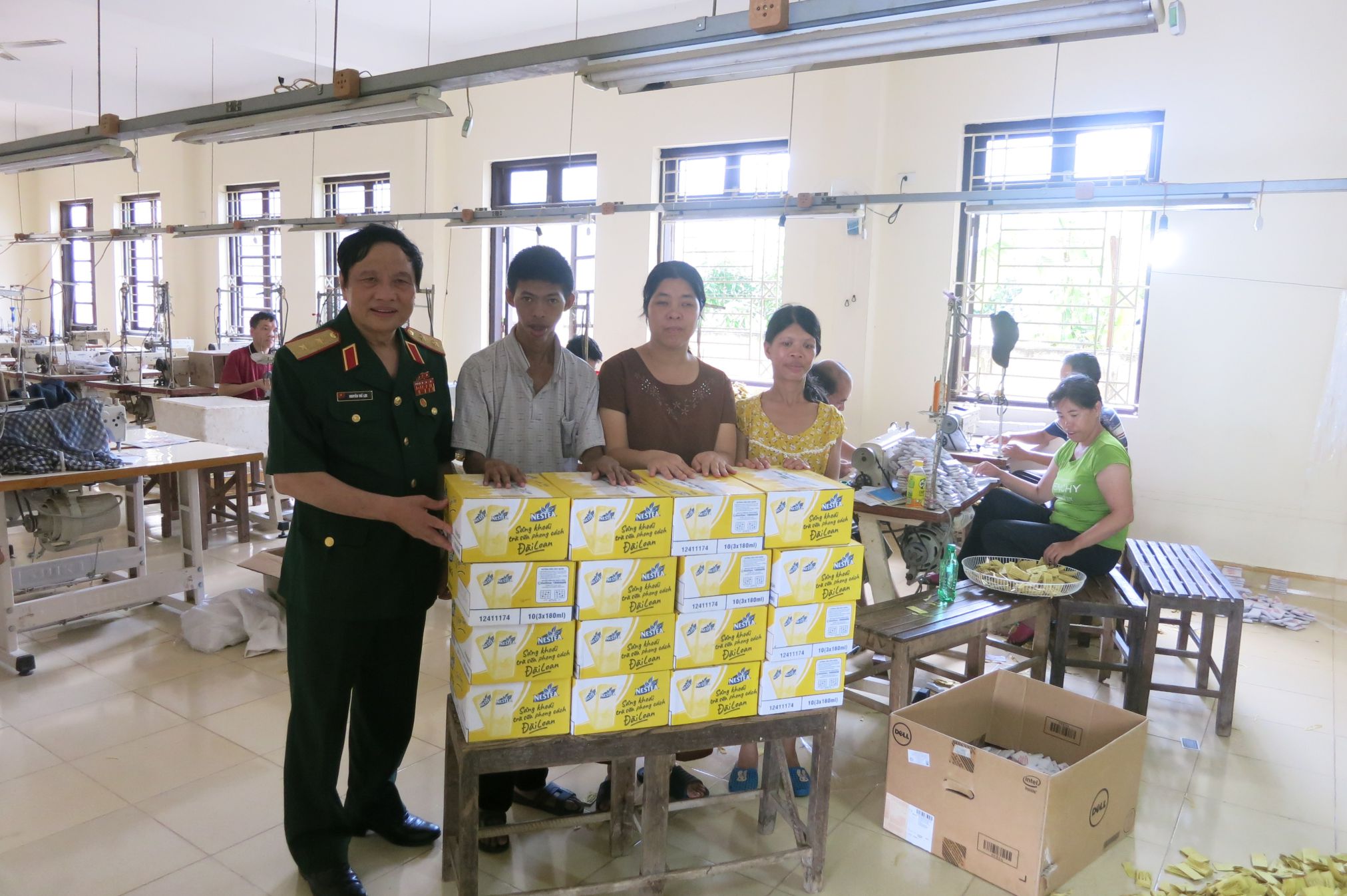 Trung tướng PGS,TS Nguyễn Thế Lực, Tổng Thư ký - Phó Chủ tịch Hội NNCĐDC/dioxin Việt Nam trao quà tại Trung tâm nuôi dưỡng, dạy nghề NNCĐDC tỉnh Thái Bình