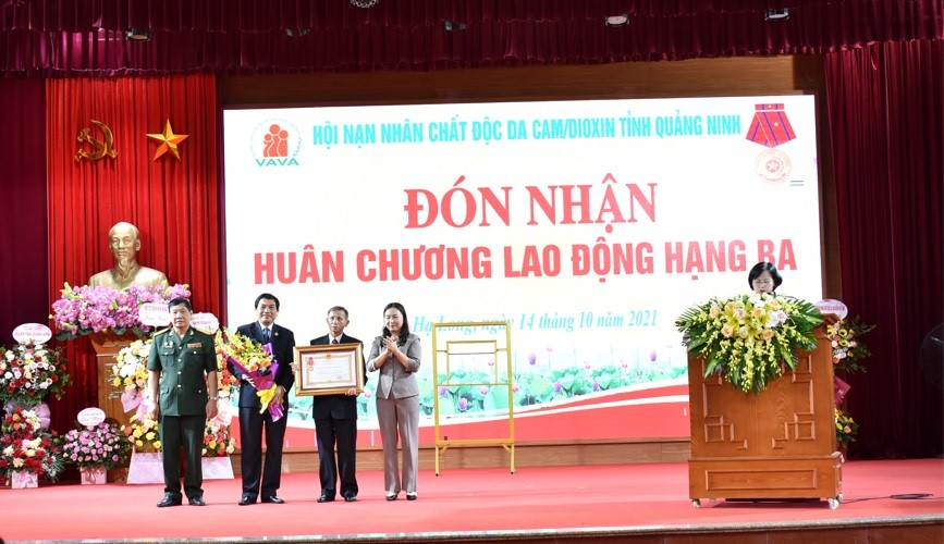 Đồng chí Vi Ngọc Bích, Ủy viên ban Thường vụ Tỉnh ủy, Trưởng ban Tuyên Giáo Tỉnh ủy Quảng Ninh trao Huân chương Lao động hạng Ba cho Hội Nạn nhân chất độc da cam/dioxin tỉnh Quảng Ninh