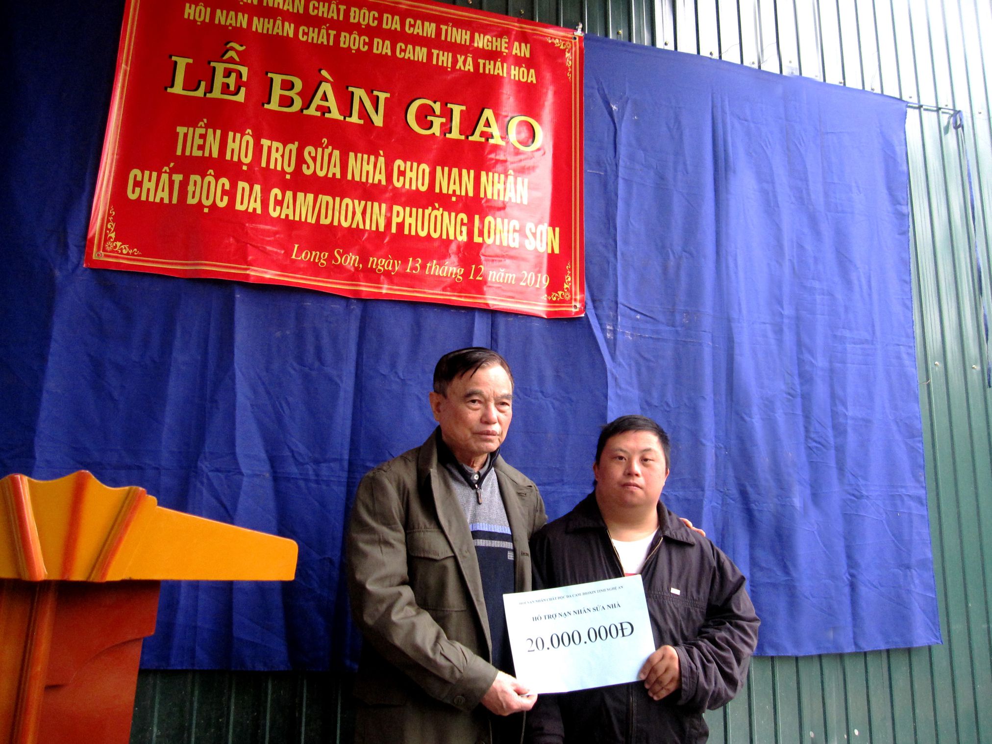 Chiều ngày 13/12/2019, Hội NNCĐDC/dioxin thị xã Thái Hòa, tỉnh Nghệ An tổ chức lễ bàn giao tiền hỗ trợ sửa nhà của tỉnh Hội cho nạn nhân Trương Thanh Hiếu, trú tại khối Lam Sơn, phường Long Sơn. Về dự lễ trao tiền hỗ trợ có ông Đinh Xuân Tứ Chủ tịch Hội NNCĐDC/dioxin tỉnh Nghệ An, ở điạ phương có các đồng chí đại diện các cấp ủy đảng, chính quyền, UBMTTQ thị xã Thái Hòa, phường Long Sơn và nhân dân khối Lam Sơn.
