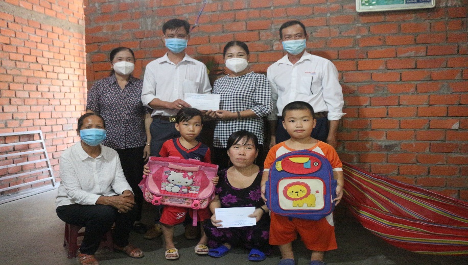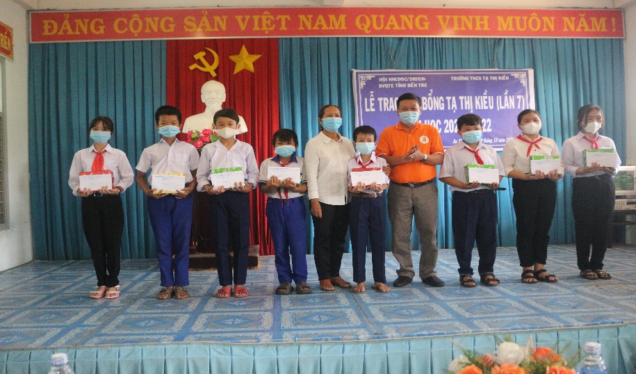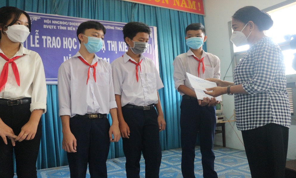 Bà Trịnh Thị Thanh Bình- PCT Hội NNCĐDC/dioxin- BVQTE tỉnh Bến Tre (mặc áo trắng) & ông Phan Văn Giang- CT. Hội NNCĐDC/dioxin- BVQTE huyện Mỏ Cày Nam (áo cam) trao học bổng cho học sinh trường THCS Tạ Thị Kiều