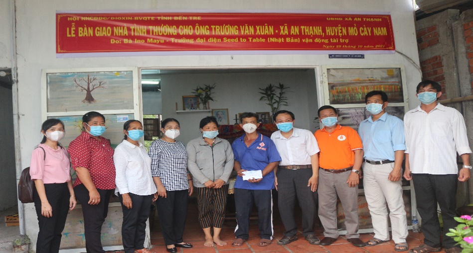 Đồng thời, Hội cũng phối hợp với UBND xã An Thạnh, huyện Mỏ Cày Nam tổ chức bàn giao nhà tình thương cho ông Trương Văn Xuân là NNCĐDC do bà Ino Mayu- Trưởng đại diện Seed to Table (Nhật Bản) vận động tài trợ 41.975.000 đồng.