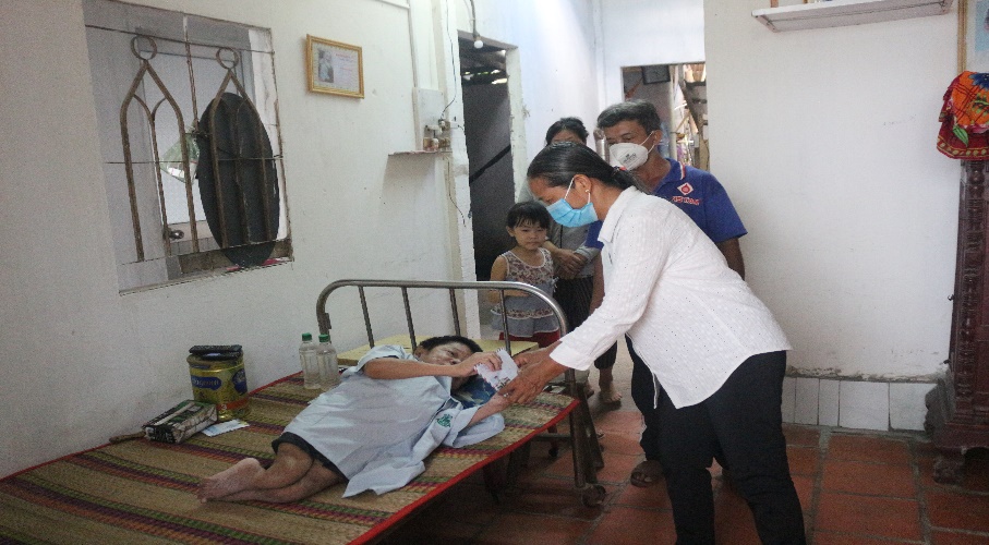 Bà Trinh Thị Thanh Bình- PCT Hội NNCĐDC/dioxin- BVQTE tỉnh Bến Tre tặng quà cho ông Trương Văn Xuân trong lễ bàn gia nhà tình thương