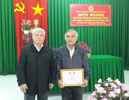 Cũng tại hội nghị này, Hội NNCĐDC/dioxin tỉnh Quảng Ngãi tặng giấy khen cho 02 tập thể và 02 cá nhân; Hội NNCĐDC/dioxin huyện Nghĩa Hành khen thưởng biểu dương 04 tập thể và 07 cá nhân có thành tích xuất sắc trong công tác hội; trao biển tri ân tấm lòng vàng cho 02 cá nhân ở thị trấn Chợ Chùa đã có nhiều đóng góp cho Quỹ chăm sóc, giúp đỡ NNCĐDC.