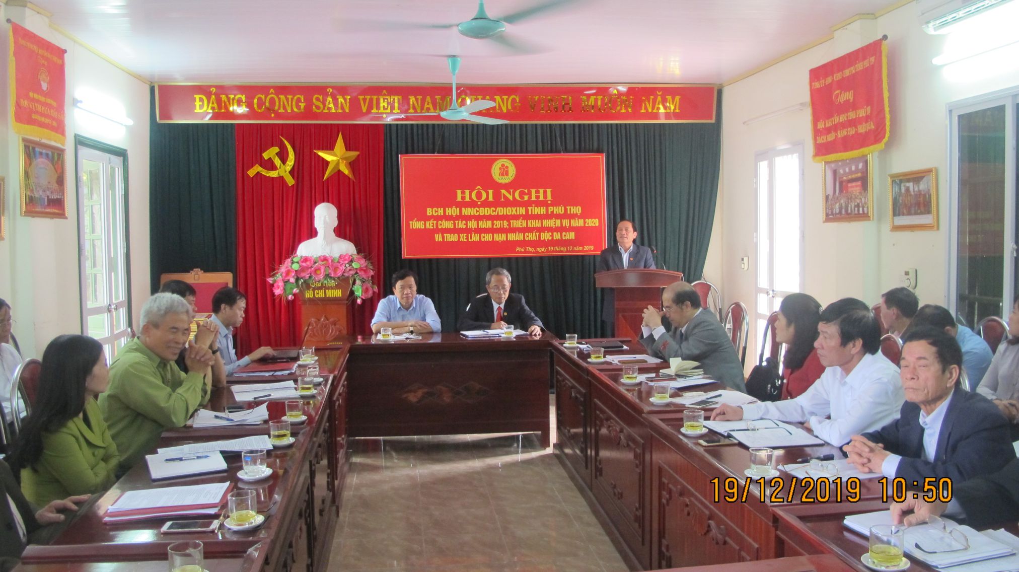 Sáng 19/12, Hội NNCĐDC/dioxin tỉnh Phú Thọ tổ chức hội nghị đánh giá kết quả thực hiện công tác năm 2019, triển khai nhiệm vụ năm 2020 tới toàn BCH Hội, 13/13 chủ tịch hội các huyện, thành phố của tỉnh và trao xe lăn cho NNCĐDC. Trung tướng, PGS,TS Đặng Nam Điền, Phó Chủ tịch Trung ương Hội NNCĐDC/dioxin Việt Nam; lãnh đạo Ban Dân vận Tỉnh ủy và các sở, ngành, hội của tỉnh cùng tham dự.