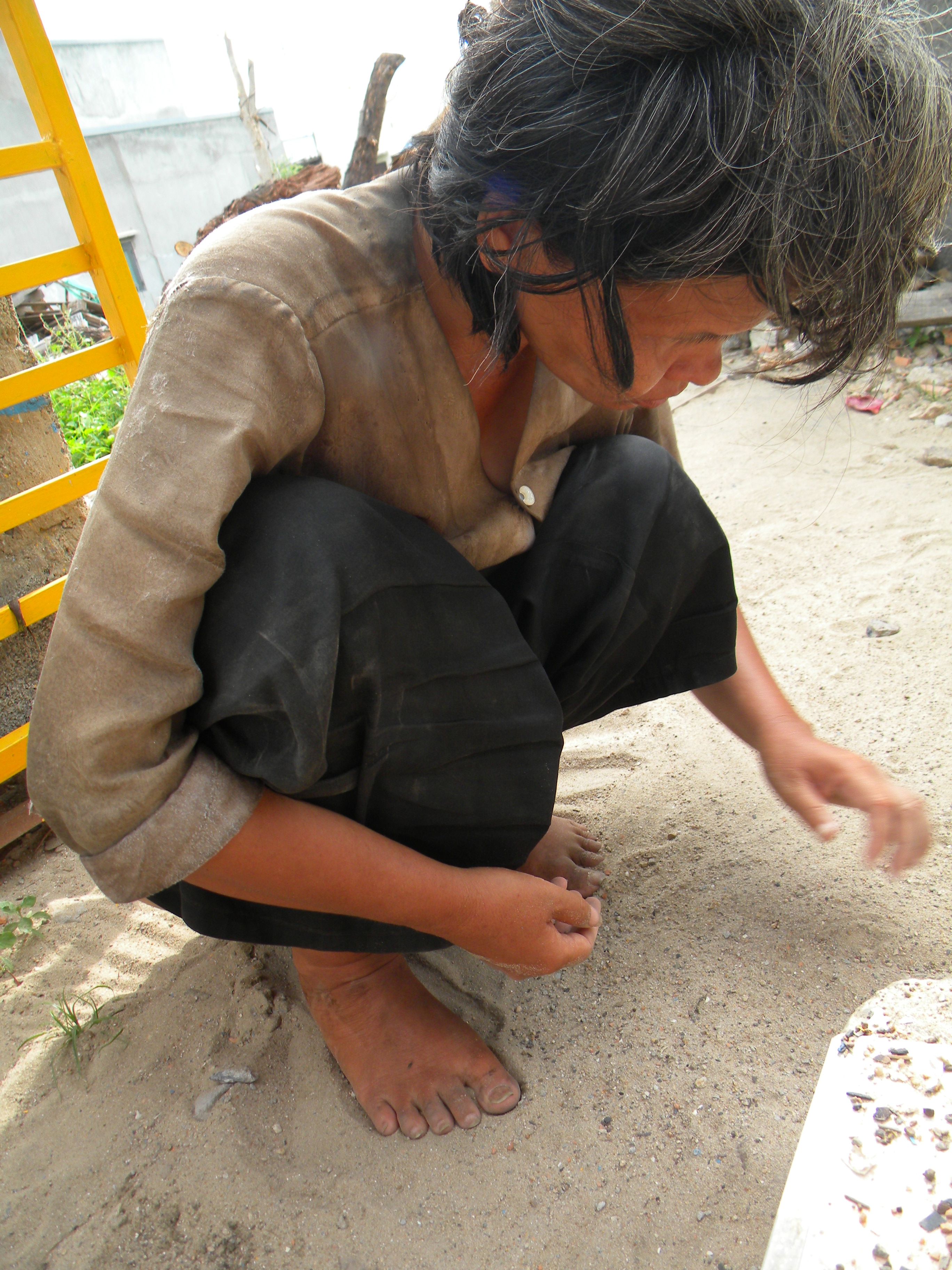 Trần Thị Duy (45 tuổi), ngồi phơi nắng, phơi mưa cả ngày chưa ăn gì, tay bốc cát trước thềm nhà